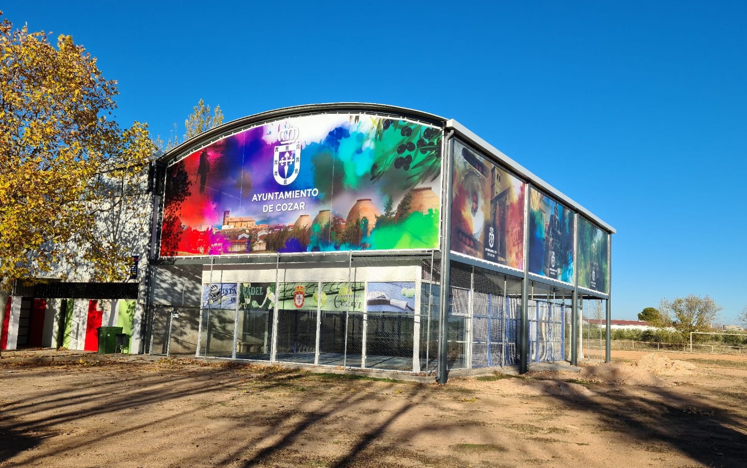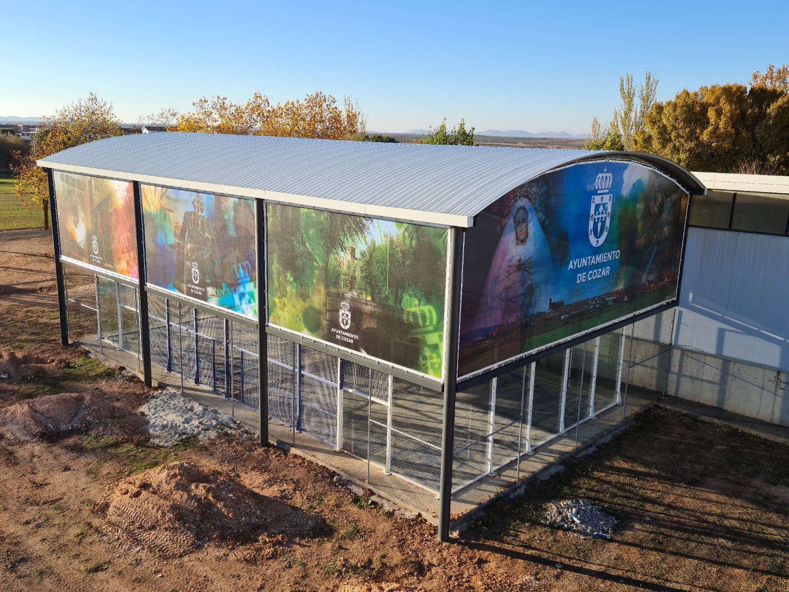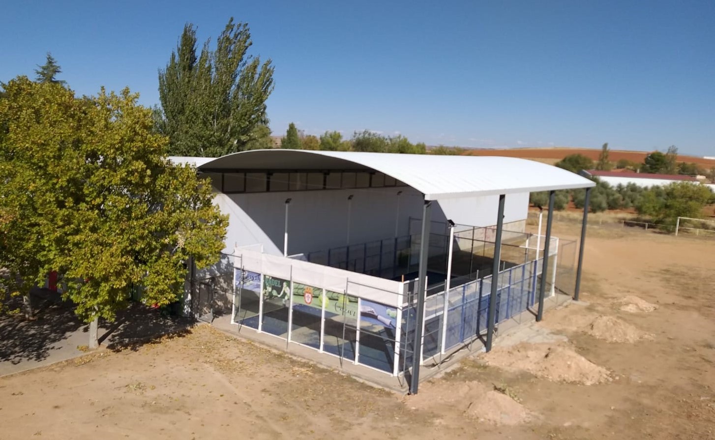 Cubierta para una pista de pádel. Como complemento a la propia cubierta, se ha construido un cerramiento lateral a base de lona microperforada impresa, personalizada. Con ello se ha conseguido una protección extra frente a viento y lluvia lateral, así como al sol. Se ha conseguido mantener el carácter exterior de la instalación. Superficie cubierta 13,50 m x 23,00 m.