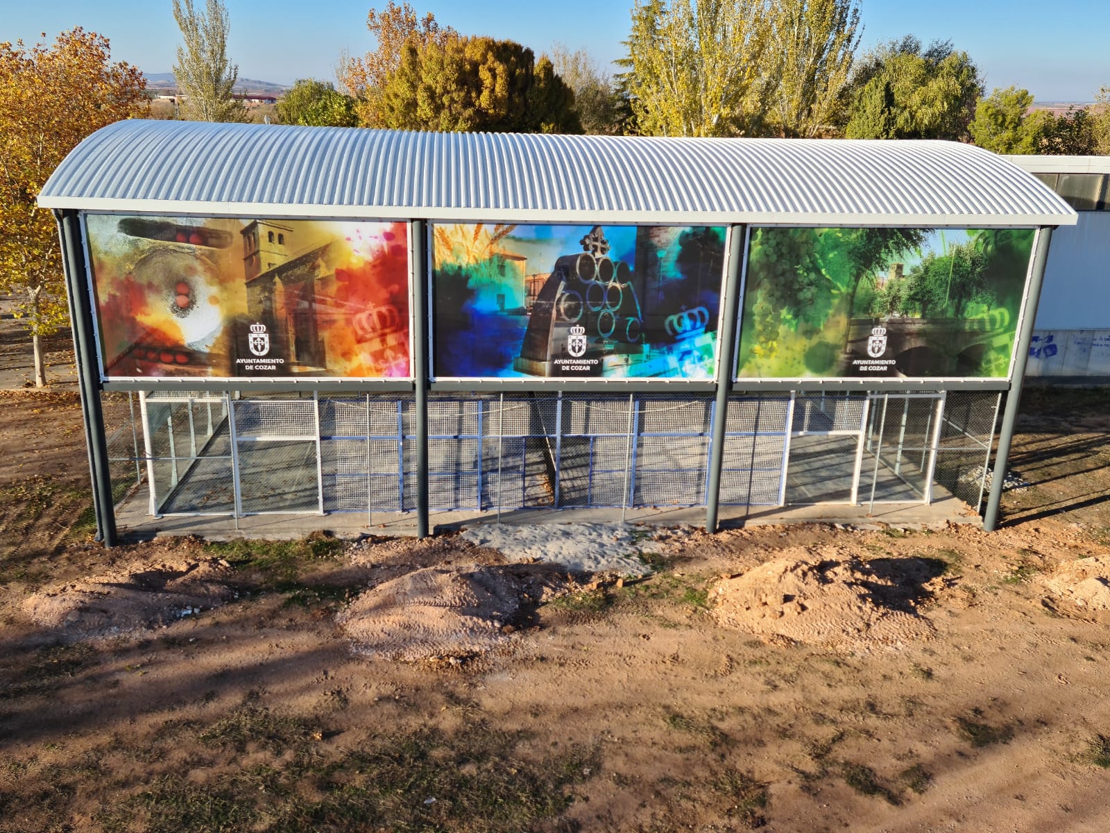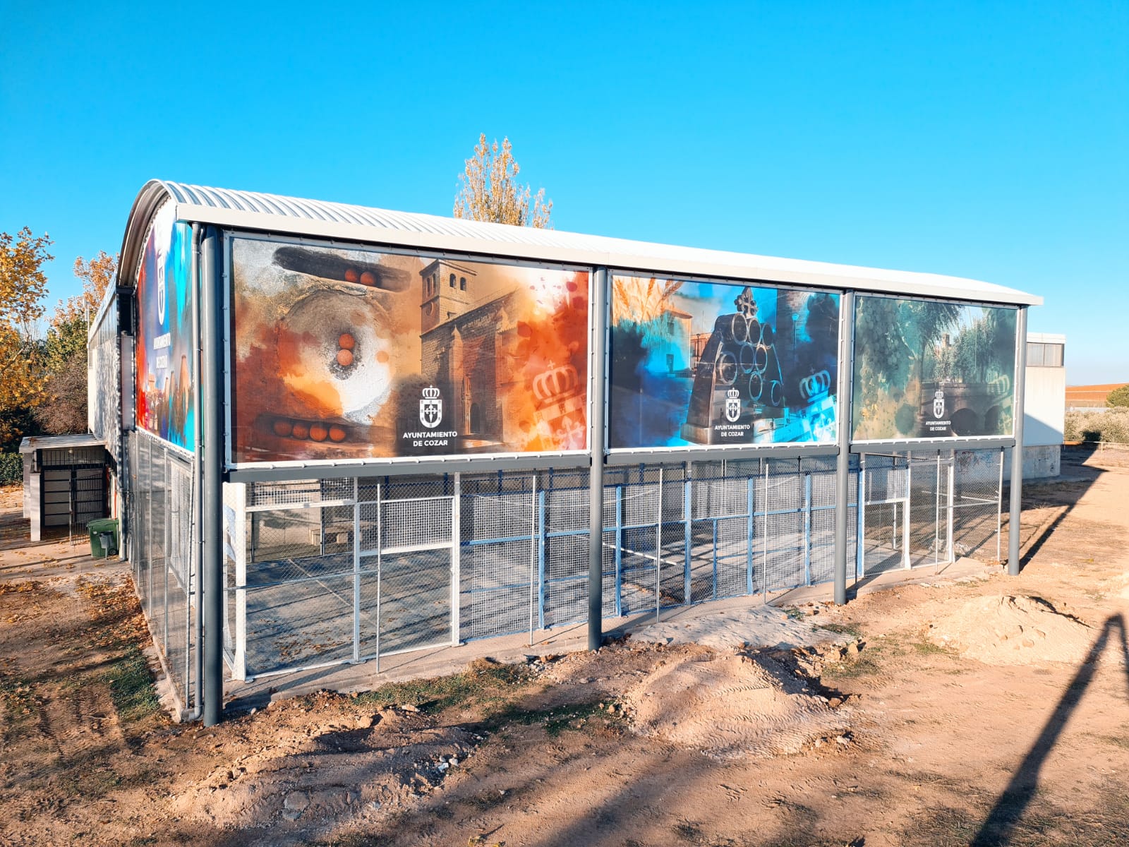 Cubierta para tres pistas de pádel con cerramiento lateral de lona microperforada impresa
